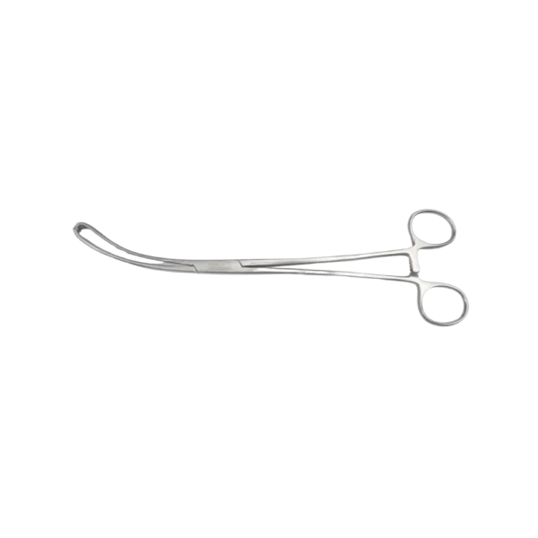 This gynecology surgical forceps is configured for procedural handling and precision, constructed from stainless steel with a matte/satin finish, featuring flat-grip handles and a curved tip. It measures 23 cm in length, is autoclavable, and is supplied as a single piece.