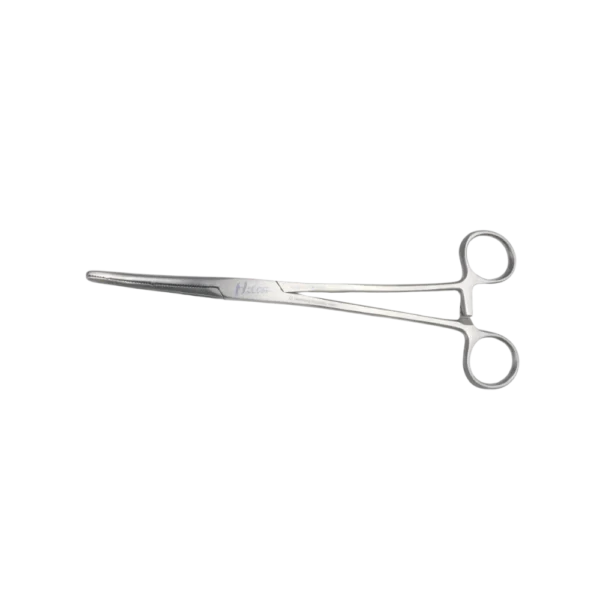 Designed for gynecology surgical use, this forceps supports controlled handling and clamping in intraoperative settings, featuring a curved tip, flat-grip handles, and a 24 cm length. Constructed from stainless steel with a matte/satin finish and compatible with autoclave sterilization, it is supplied as a single piece.